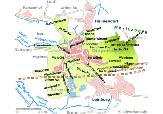 - Die ehemalige Gemeinde Diepersdorf, am Fuße des Moritzberges gelegen, ist seit 1978 im Zuge der Gebietsreform mit seinem Ortsteil Scherau ein Bestandteil der Gemeinde Leinburg geworden.